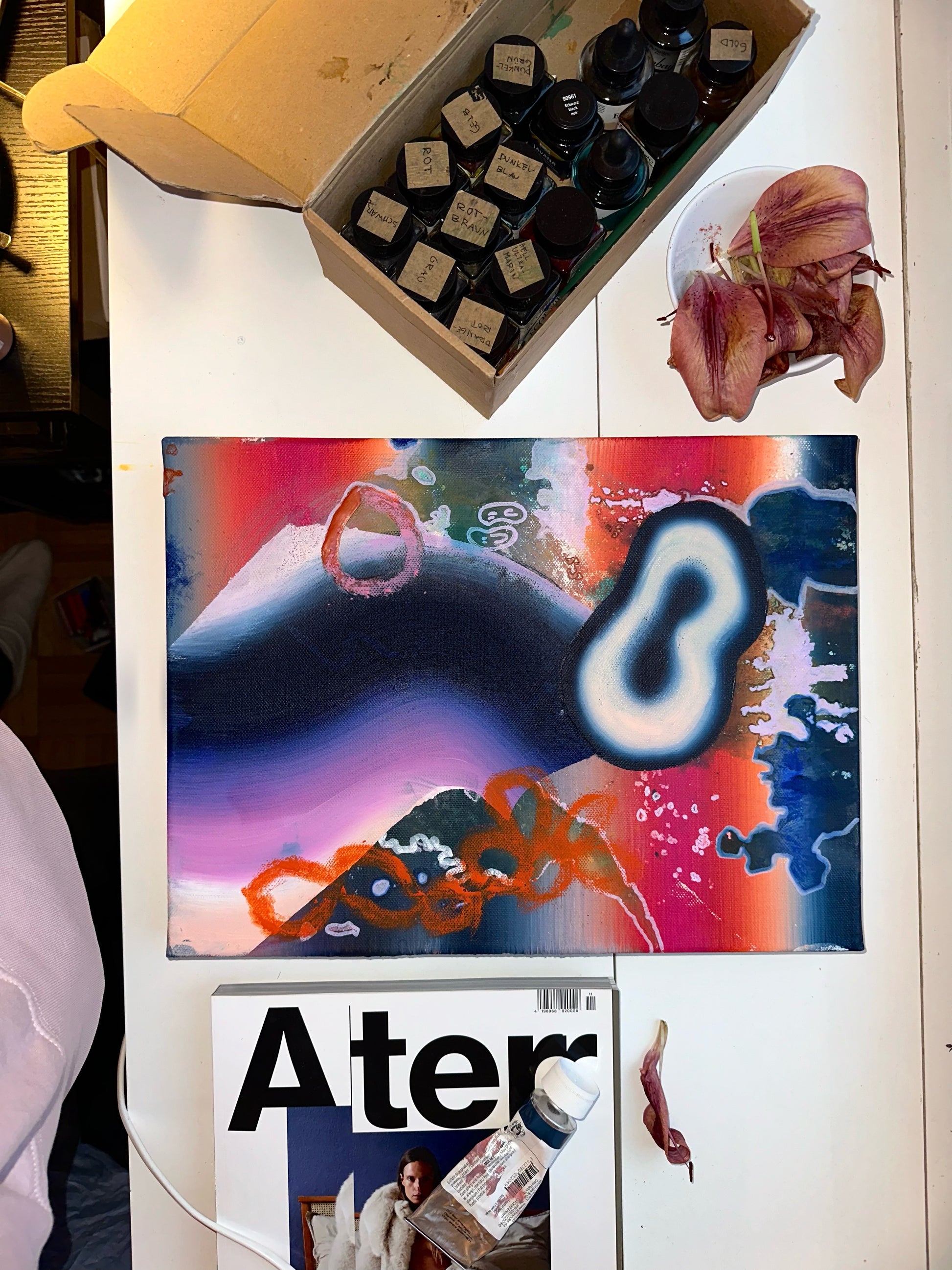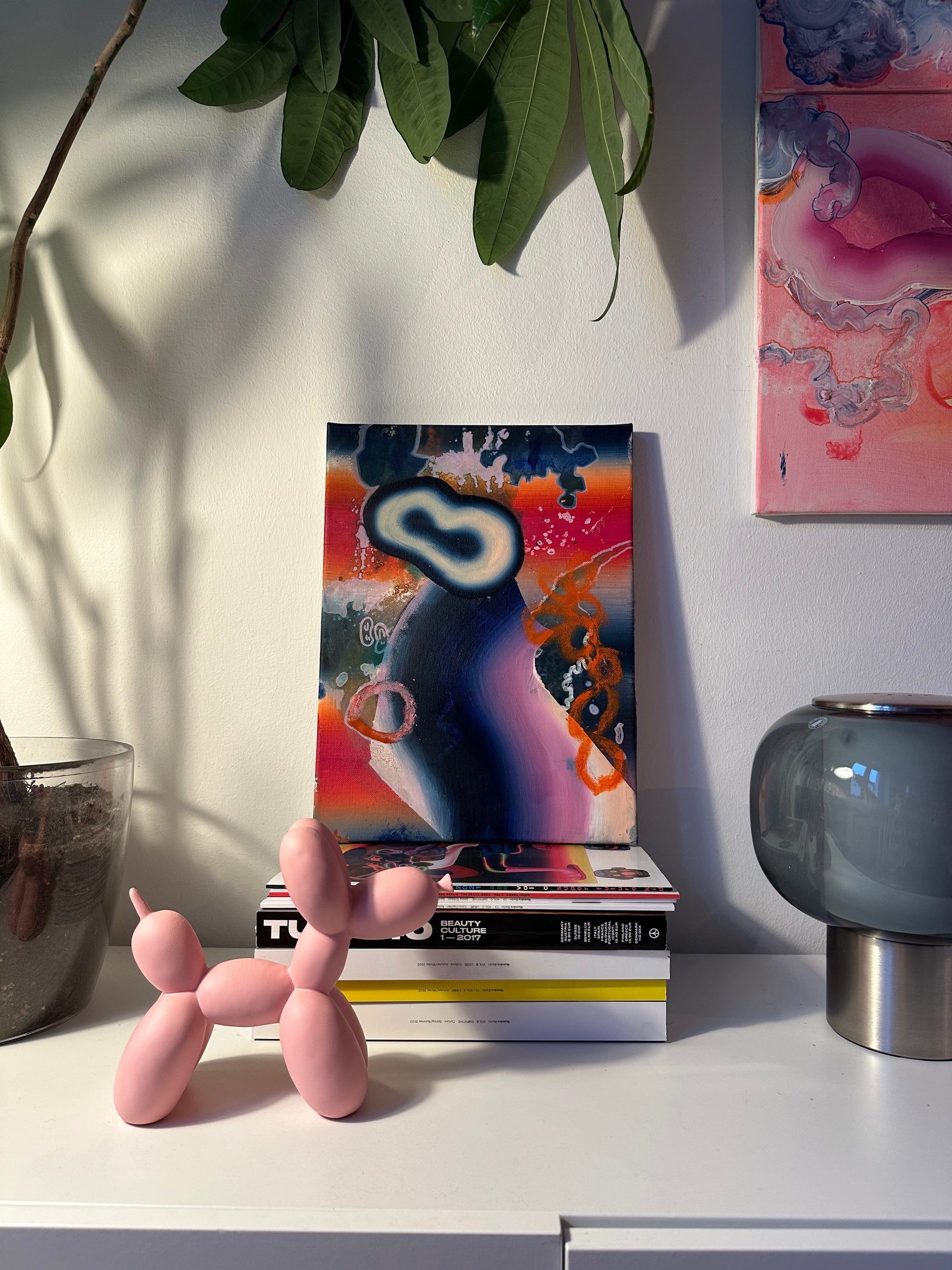 dynamische Landschaft, die mit dunklen Tönen und auffälligen Akzenten arbeitet. Weiche Übergänge von Blau und Pink kontrastieren mit abstrakten, weißen und orangenen Linien, die eine fließende Bewegung andeuten. Ein zentraler, fast leuchtender Bereich erzeugt Tiefe und Spannung.